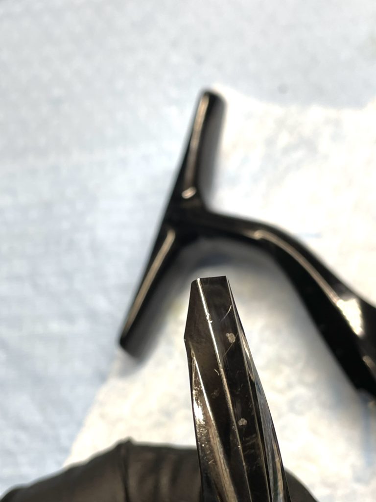 このヒット跡ですね。落下かどこかにぶつけた衝撃で簡単に折れます。