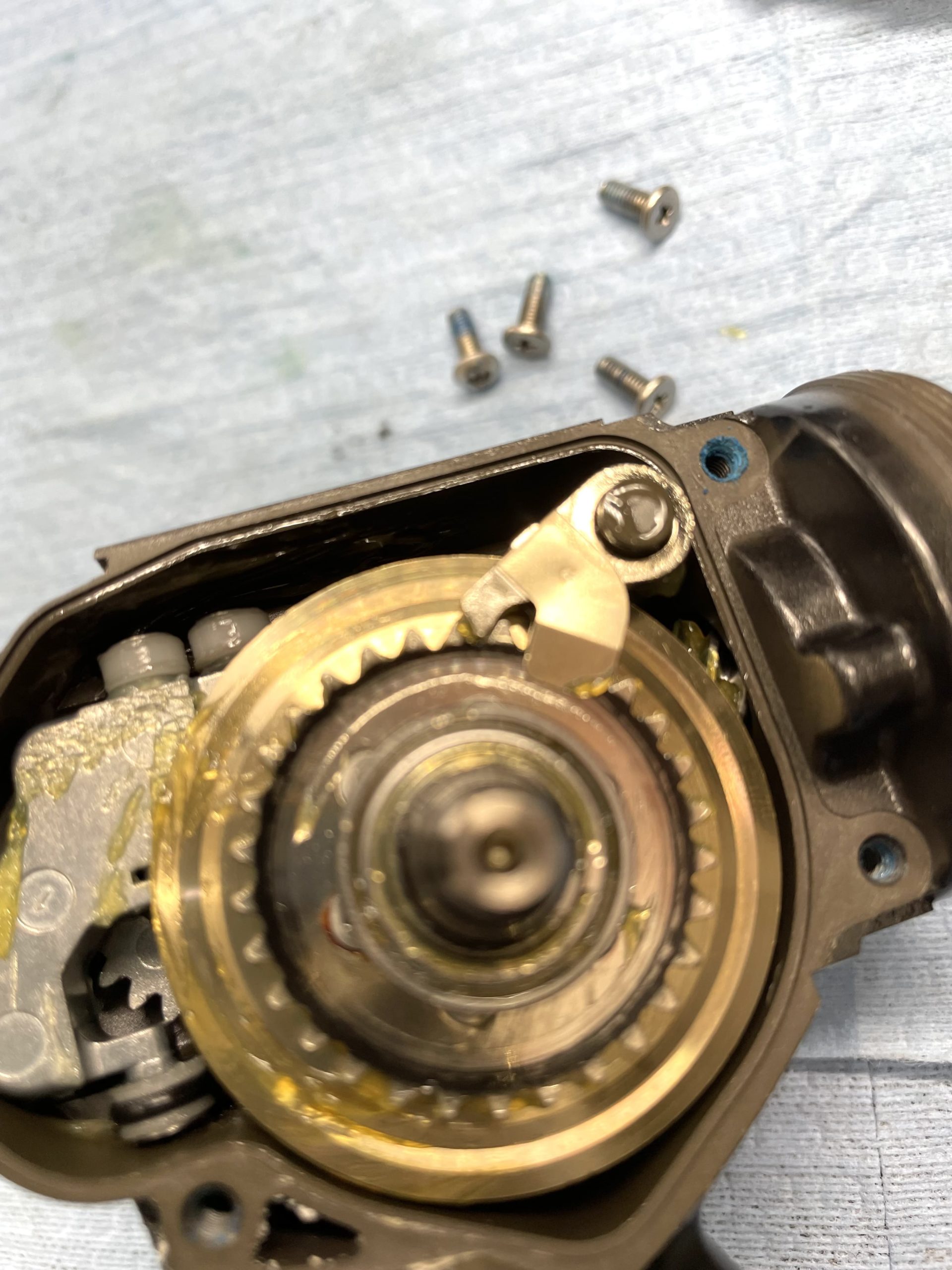 ただ、ギアクリアランスがデフォルトのままだとギア飛び部とオシレートギアの削れ変形の影響でカツンカツンと当たります。