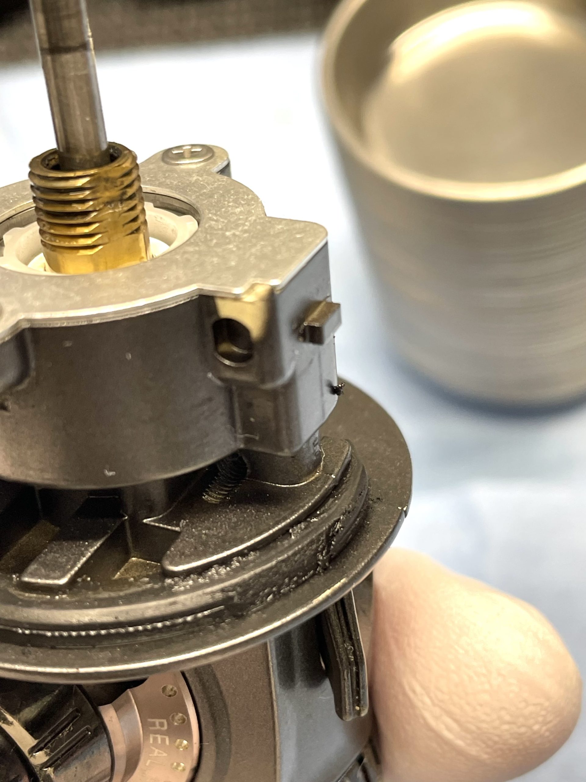 ・ドラグ関連で金色座金が変形しており、スプール抜き差しが非常に硬いです。