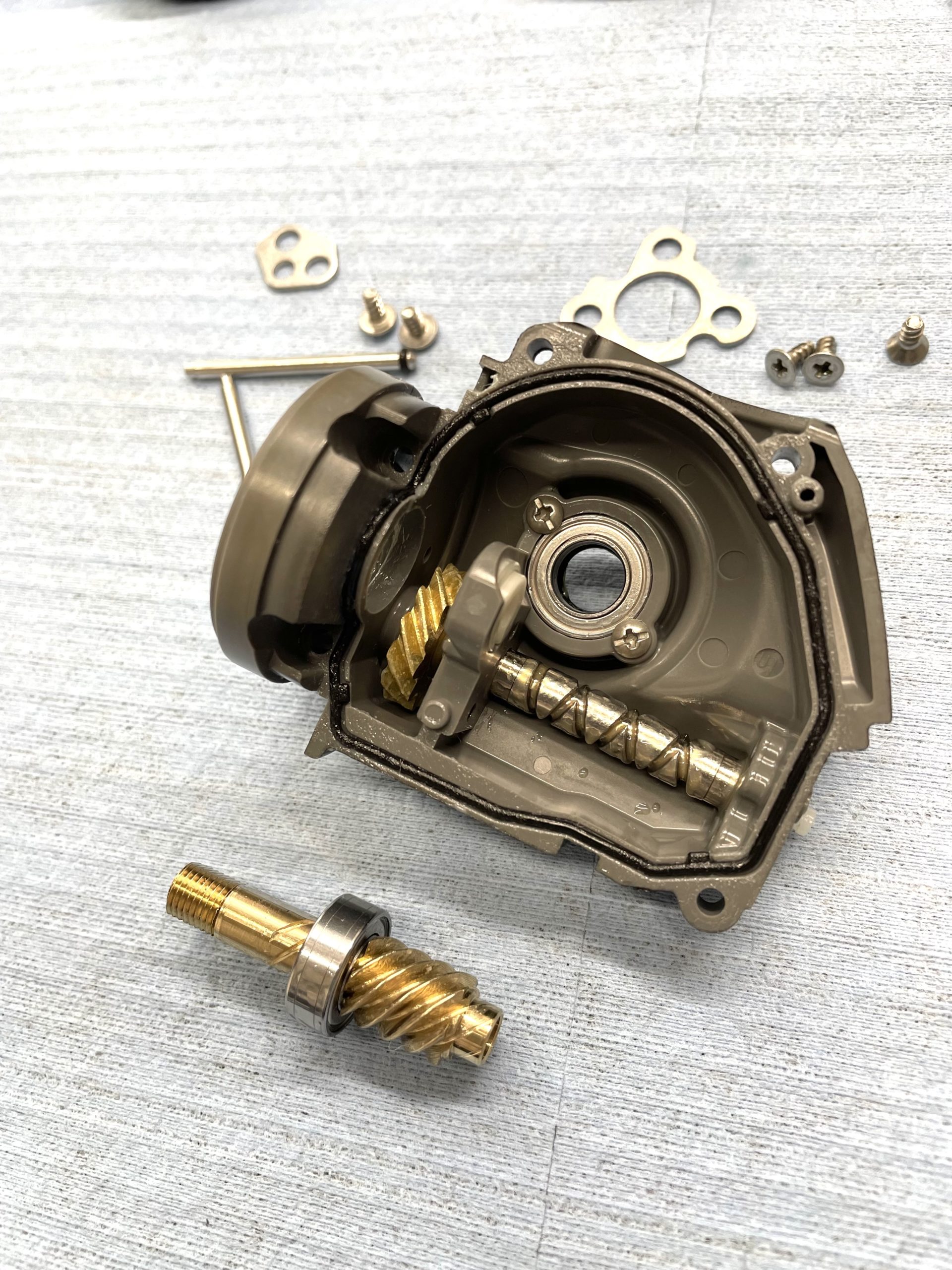 カラカラ異音は分解点検時に確認済み、新品部品組み付けた感じからウォームシャフトで間違いないです。