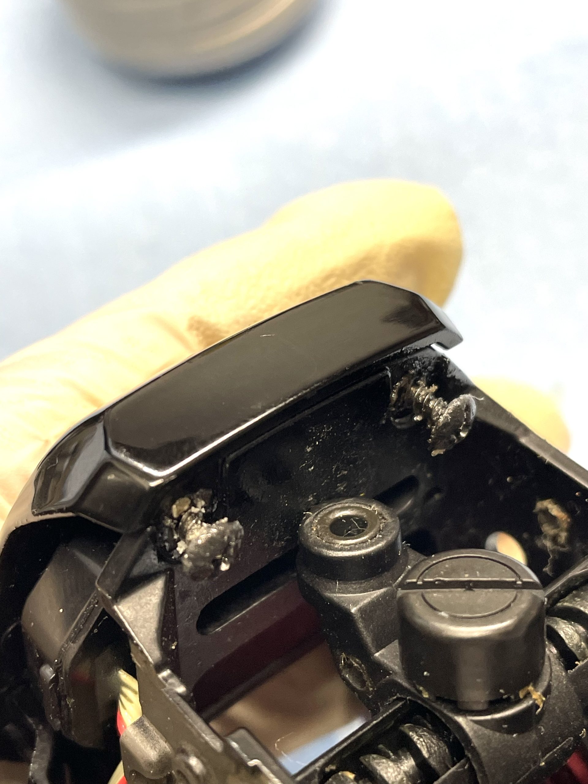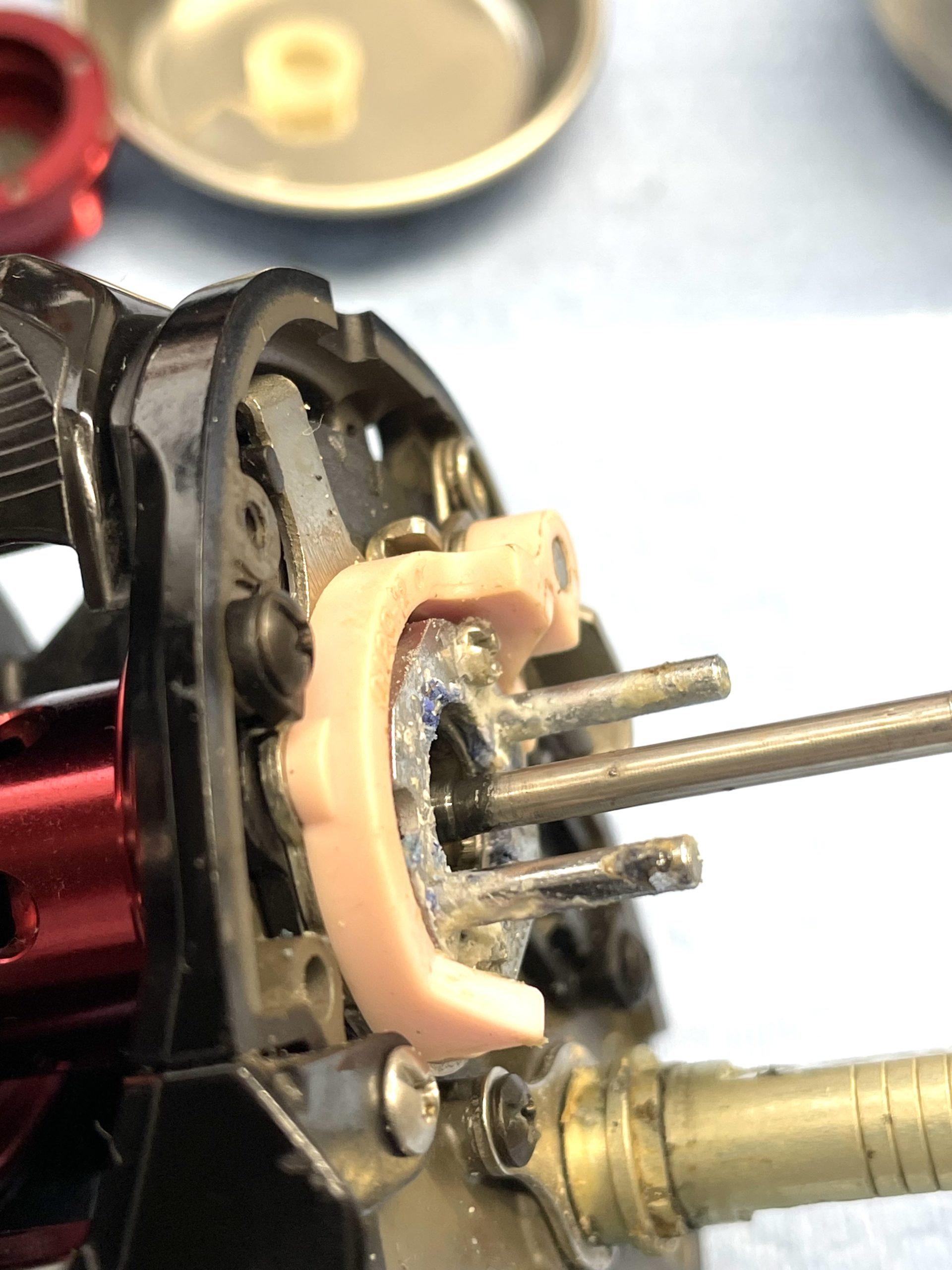 右の画像のクラッチカム抑え板、素材が荒れすぎで交換が必要です。
