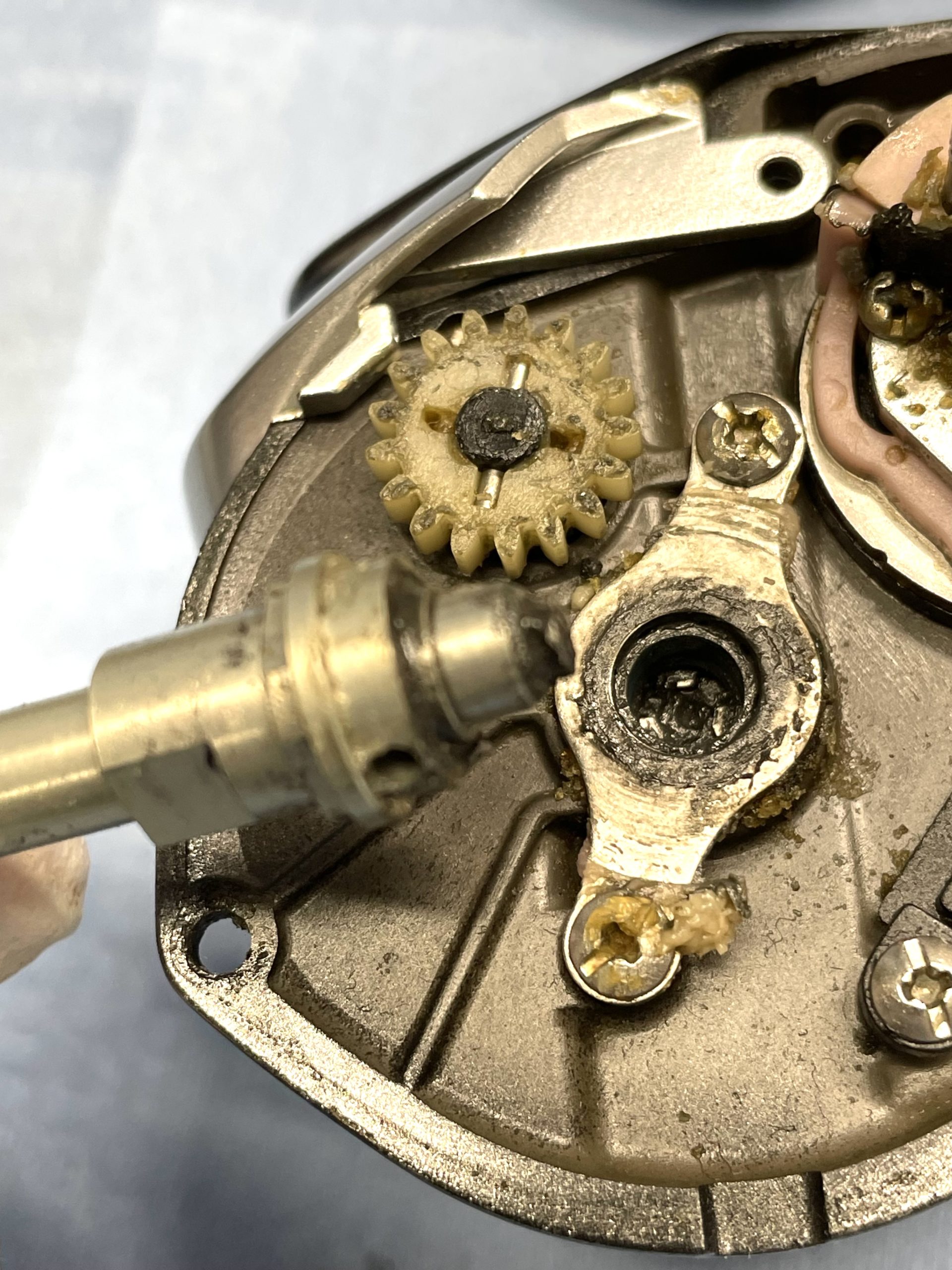 メカニカル内のベアリングはピニオンギア上部にあたり、お客様の固着度合いで無理に使うとギアに負担がかかりシャカります。