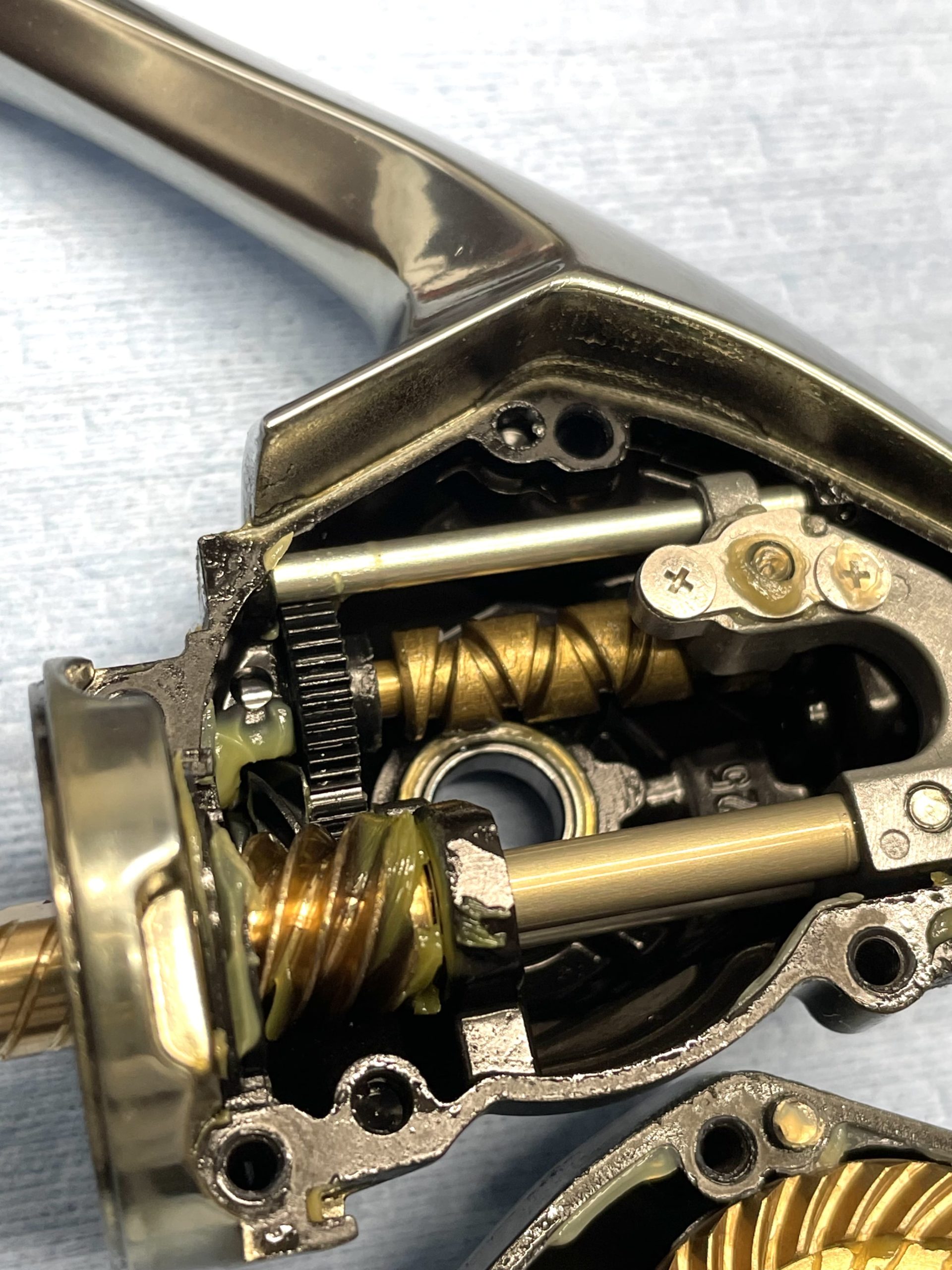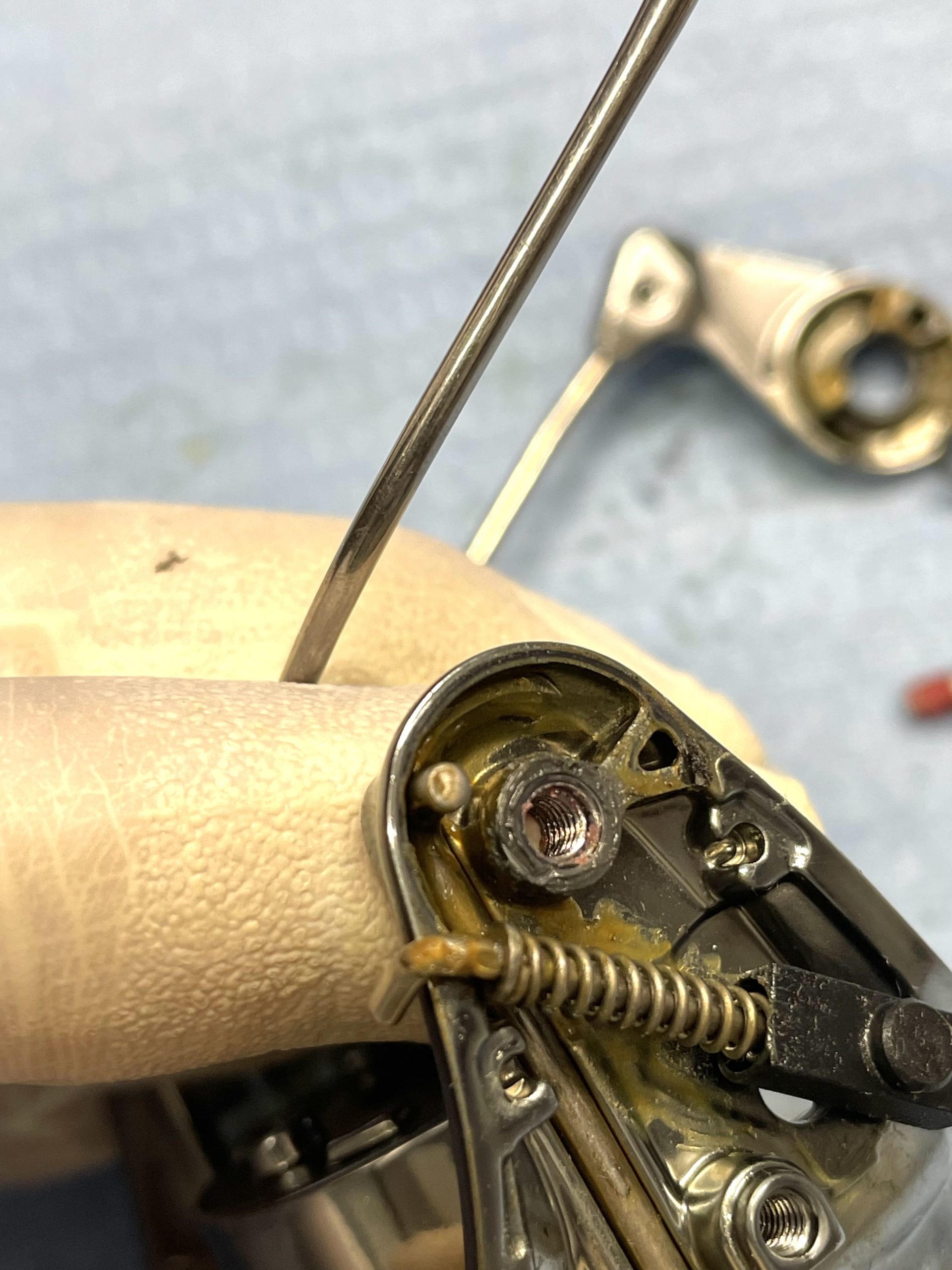 接合部の緩みを気にされてましたが、ネジの緩みなどではなくベールアーム落下傷もあるように変形で生じている状態です。